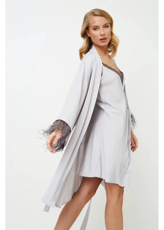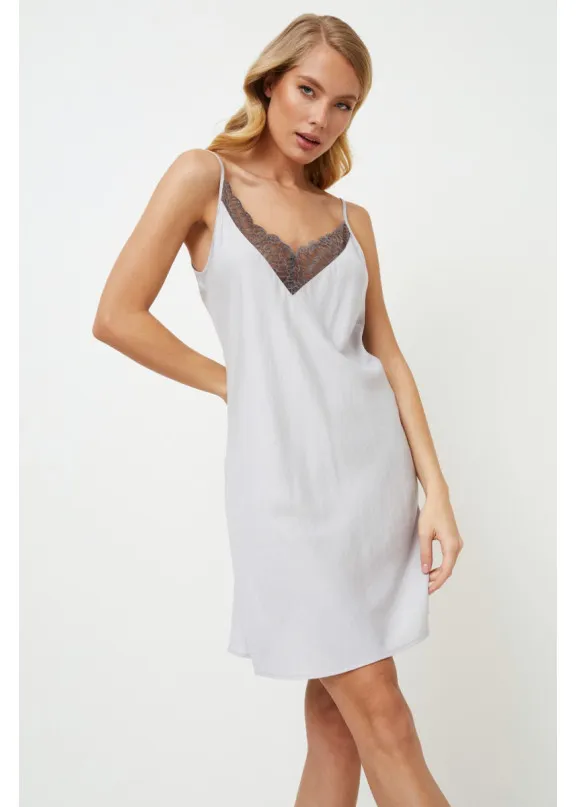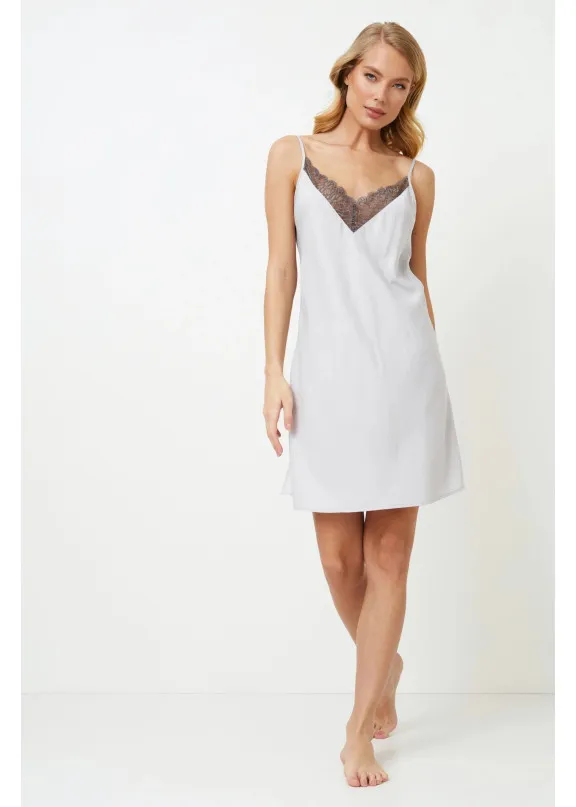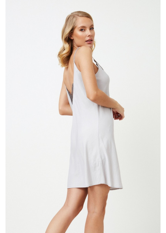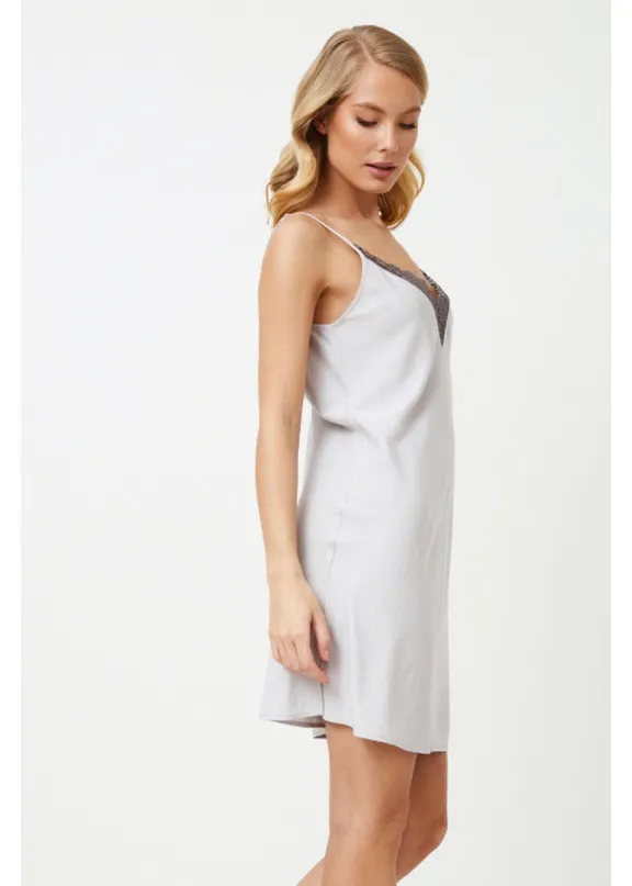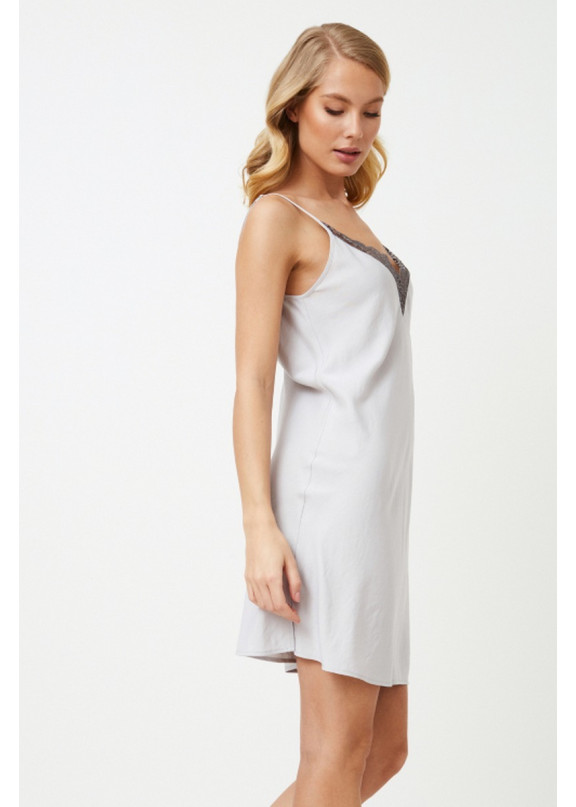 Шикарно и великолепно...не требуется больше слов… Ночная сорочка Brigitte выполнена из очень мягкой ткани нежно-серого цвета с эффектом шелка. Декольте украшено красивыми кружевными элементами темного цвета. Для вашего удобства бретельки регулируются сзади. Ночная сорочка имеет боковой разрез внизу для удобства движений.