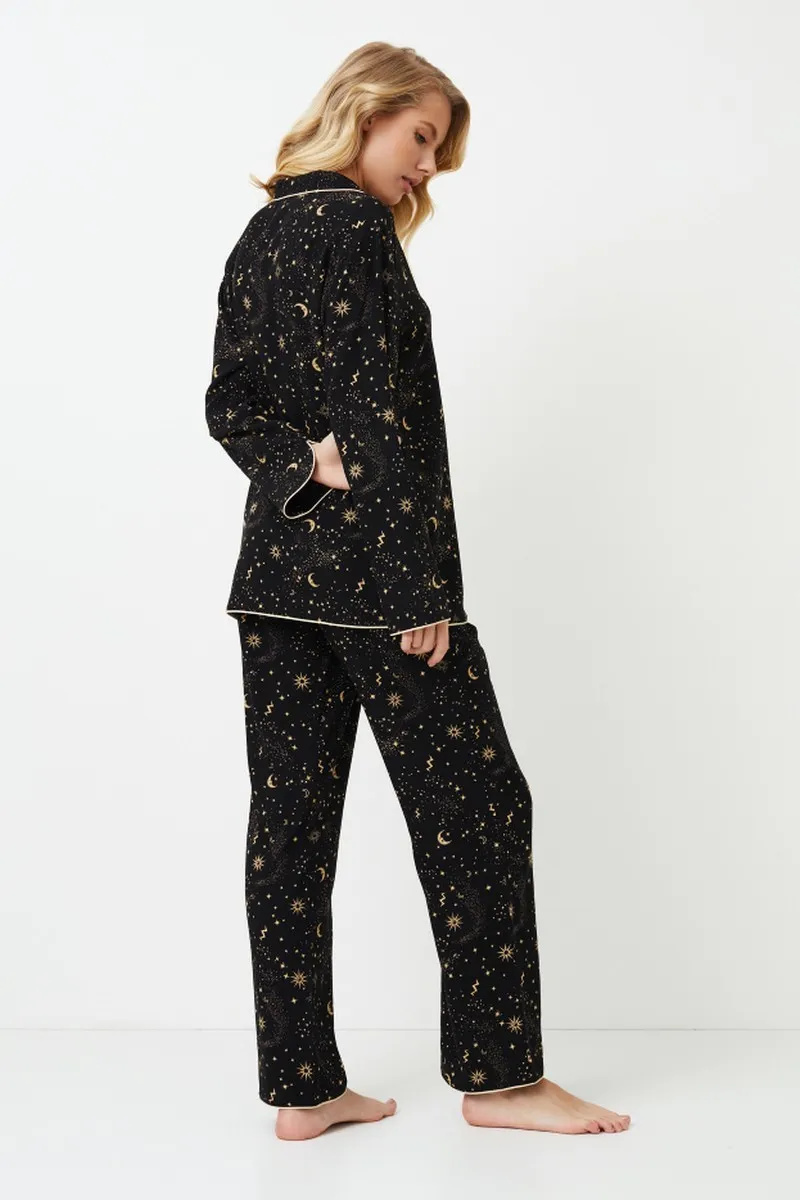 Представляем вашему вниманию длинную пижаму Alexandra, в которой уют сочетается с шиком, создавая ощущение блаженства перед сном. Рубашка с длинными рукавами застегивается на пуговицы и имеет стильный V-образный воротник с контрастной окантовкой по краю воротника спереди, низу и рукавам. Брюки классического кроя с удобными карманами и окантовкой в тон по нижнему краю. Пижама потрясающего черного цвета, украшенная золотыми орнаментами ночного неба, оживляет образ перед сном. Насладитесь ночным очарованием в пижаме Alexandra pajama long, каждая деталь которой излучает небесное очарование. Ткань - вискоза.