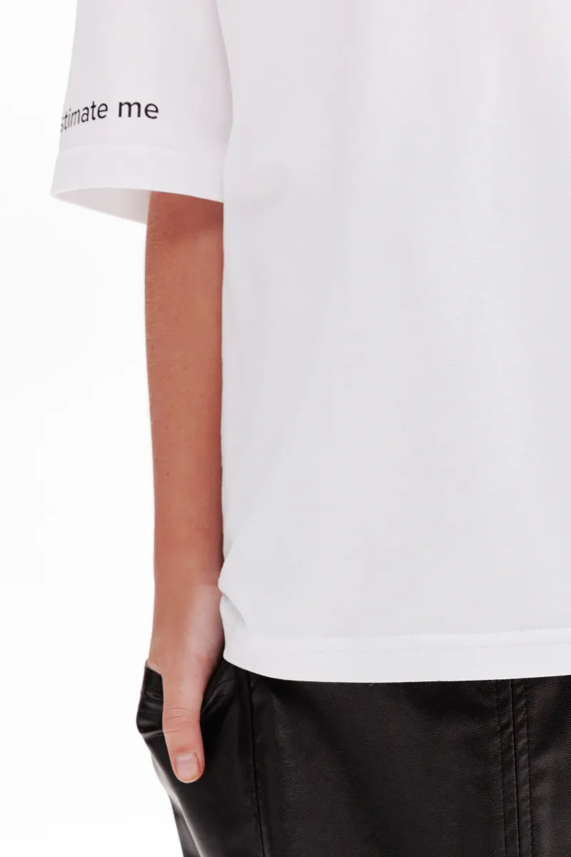 Белая футболка. Прямая объёмная модель со спущенной линией плеча. Удлинённые рукава и эластичная горловина из рибаны обеспечивают комфорт. Авторский мотивационный принт. Универсальные модель, которая легко комбинируется и подходит для разных случаев.