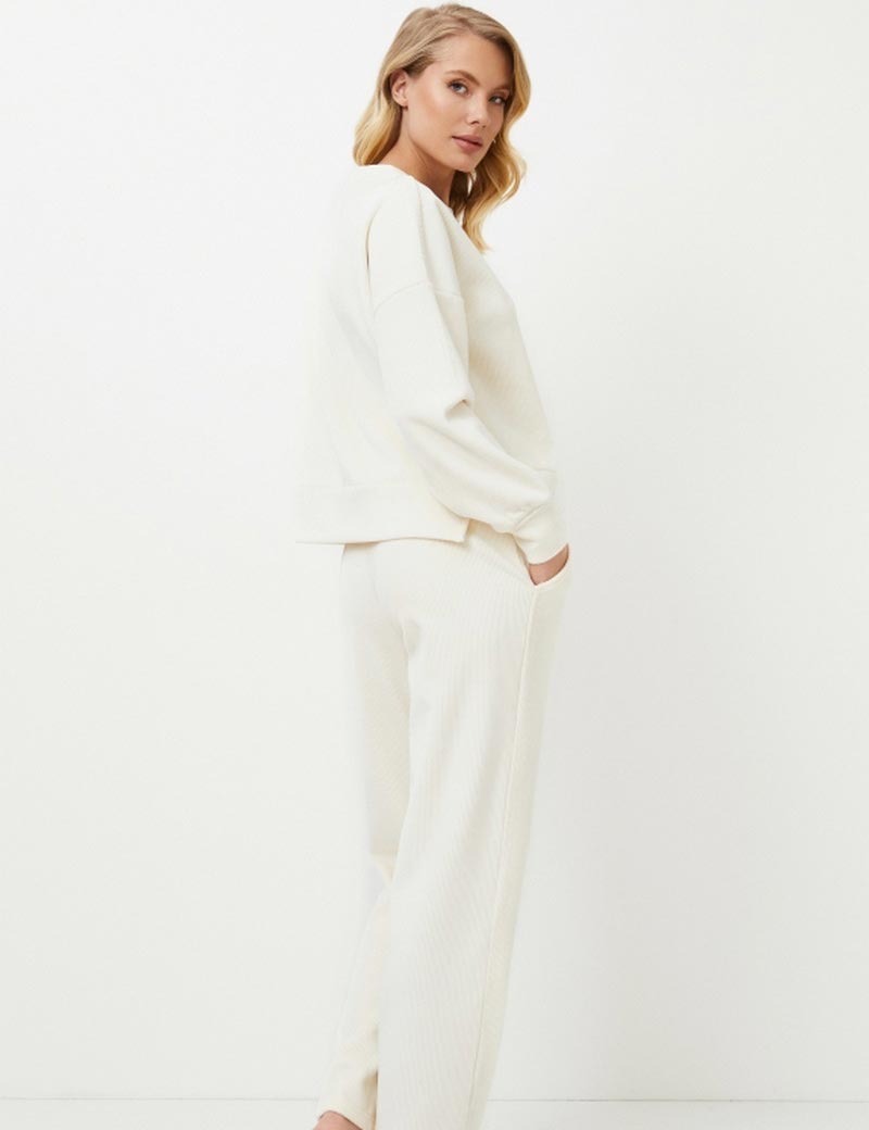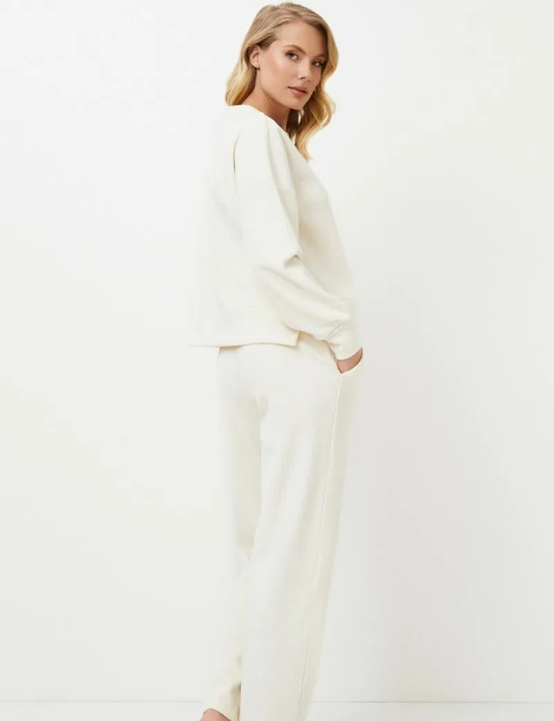 Теплый пижамный комплект NORELLA от литовского бренда Aruelle изготовлен из плюшевого полотна расцветки экрю. Состоит из кофты с длинными рукавами на манжетах и брюк. Подходит для холодных вечеров и дней, даря приятное ощущение тепла.